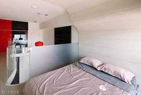 通过弧线的木作造型将床头上方原始建筑物的大梁虚化,同时减缓压迫、局促感,一旁衣柜以黑、红色烤漆玻璃做门扉的设计,将之延展至原建筑物栋梁上,有拉长屋高的效果