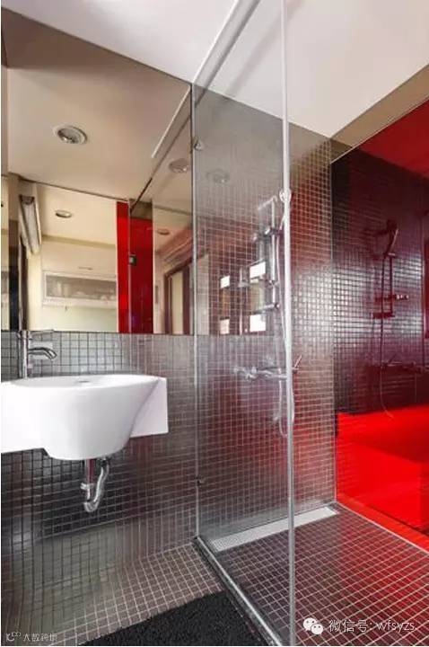 由玻璃做区分,金属马赛克砖使卫浴充满潮流性及时尚感,大面积的明镜设计,更将视觉透过清玻璃与公共空间延展而结合。