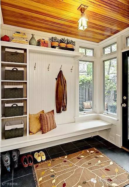 秋天的叶子散落在地毯上,可爱的小植物整齐的摆放在玄关的搁架上,悠闲的进门玄关装修有两扇清透的玻璃窗,挂钩上面挂着主人的衣服,隔板上的靠枕给玄关装修增添了温馨的感觉。
