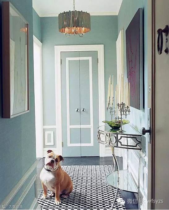 清新淡雅的居室色彩,简单的欧式风格,精致的铁艺玄关台,风情的烛台,抽象的装饰画,温暖的吊灯和可爱的小狗为走廊增添了生活的趣味。