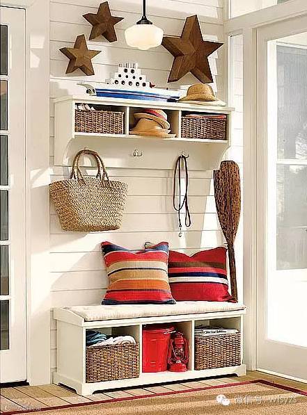 白色的收纳柜上面可以坐人,下面是功能强大的藤编收纳筐,搁架上混搭了挂钩,三颗实木材质的星星装饰让进门玄关更添乐趣。
