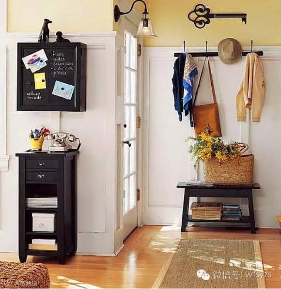 黑色的木凳上面有一篮黄色的野花,让玄关充满田园香味,主人随身的衣物给居室带来了满满的爱。