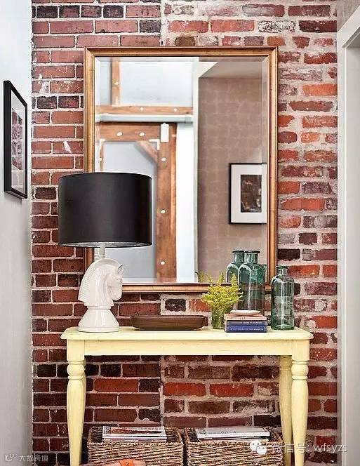 以砖石作为背景墙,一面铜边的装饰镜挂在背景墙上,简单利落,镜子前的白色玄关台,搁架上摆放着便于收纳的编织筐,台上的艺术台灯和新鲜的花草把玄关设计推向了艺术的风范。