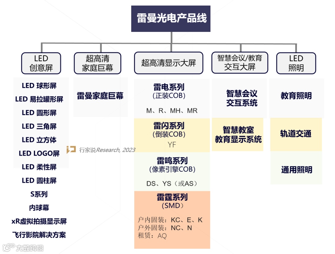 据行家说Display了解,雷曼光电业务主要分为三大板块,分别是COB显示屏、SMD显示屏和LED照明产品。
