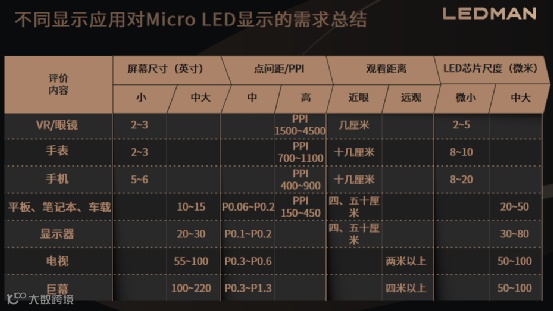 Micro LED显示应用场景丰富,涵盖微小型尺寸至超大型尺寸产品,包括VR、AR、眼镜、手表、手机、平板、笔记本、车载、显示器、电视、巨幕显示墙等。不同尺寸的产品对于像素密度、点间距和观看距离等方面的要求各不相同,对Micro LED芯片的大小也提出了不同的要求。