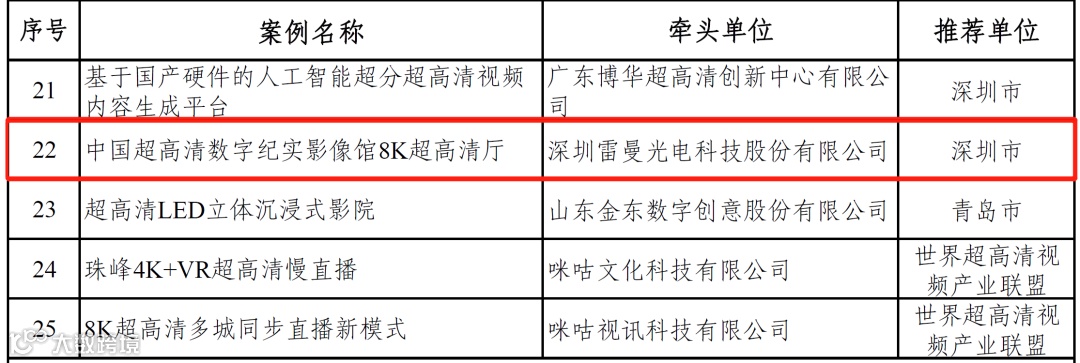 雷曼光电的《中国超高清数字纪实影像馆8K超高清厅》项目强势上榜