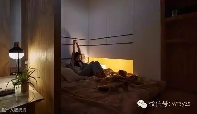 床的周围有很多储物柜,暖暖的灯光洒满了这个小小的隔出来的卧室,灰调的棉麻床品毫无维和感,竟莫名多了一种安全感。