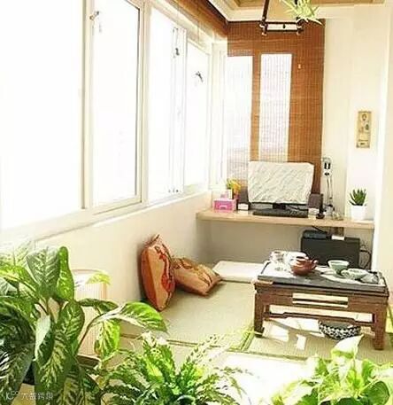日式的和风装饰,将阳台改造成茶室,给自己一个休养生息的地方。坐在榻榻米之上,透过竹帘的阳光变得柔和起来,竹香与茶香的融合,生活就应该注重品质的提升。