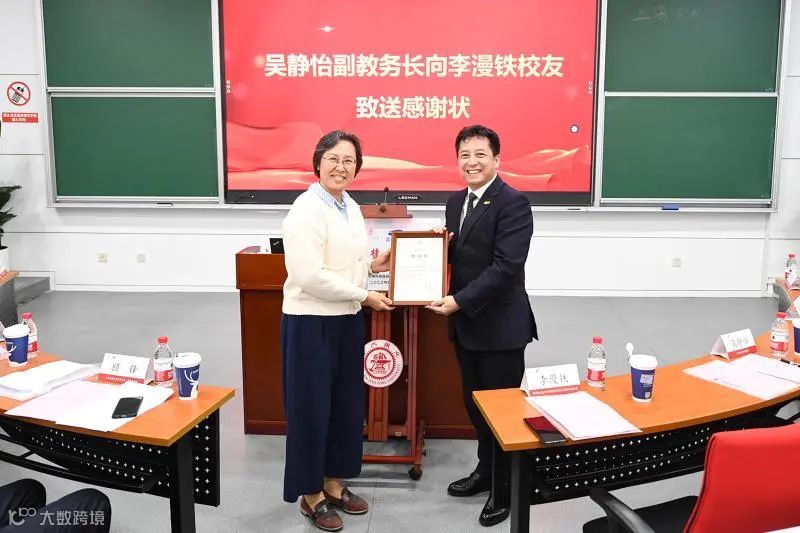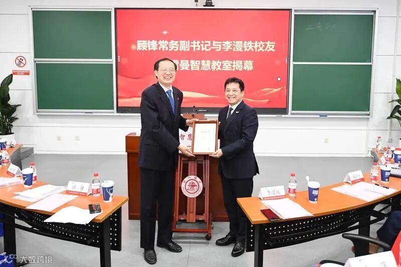 顾锋与李漫铁共同为智慧教室教育显示系统揭幕,并颁发捐赠证书。吴静怡向李漫铁致感谢状。