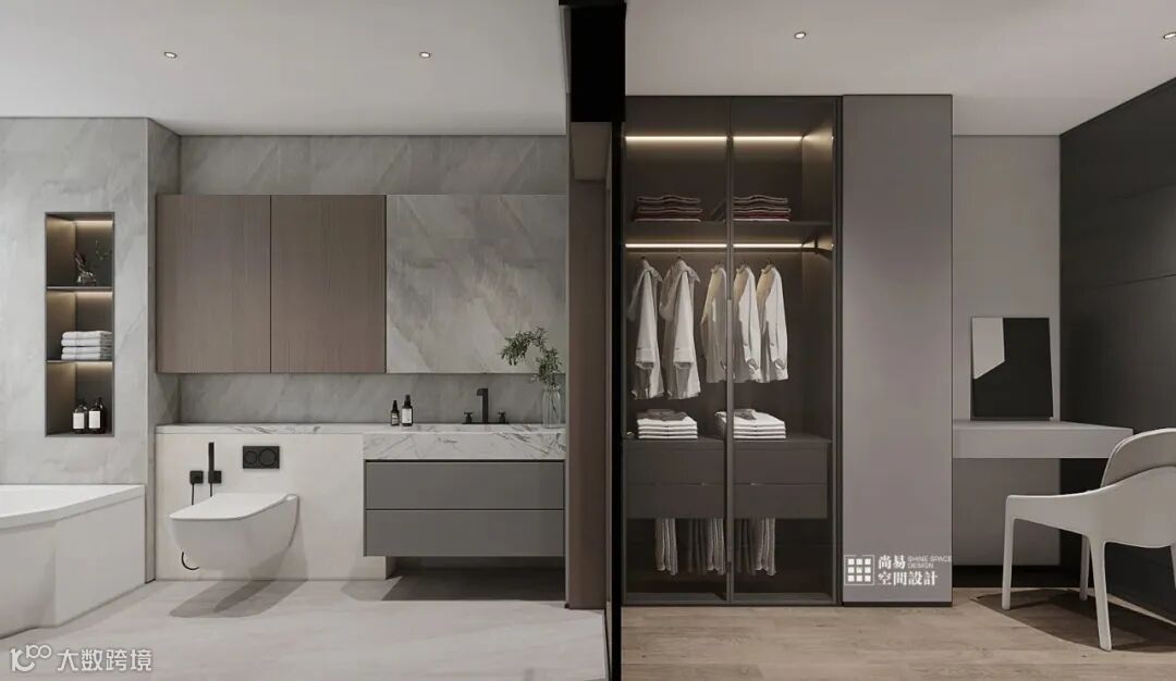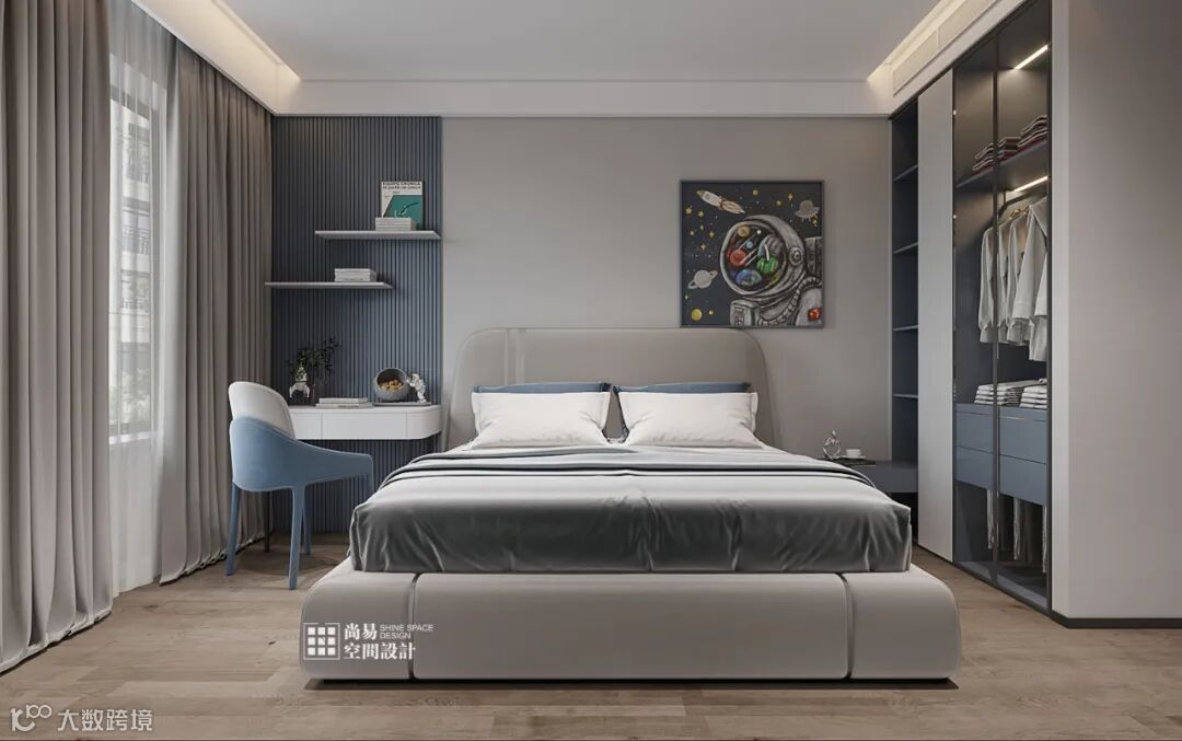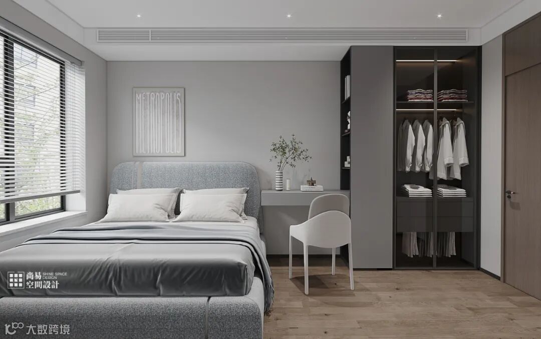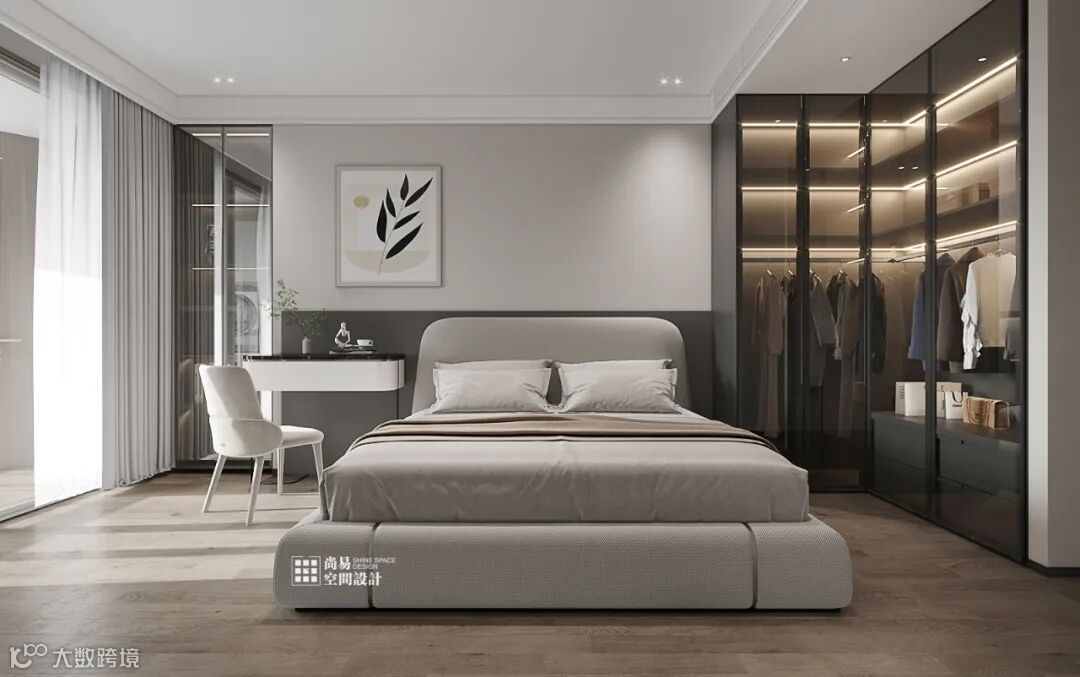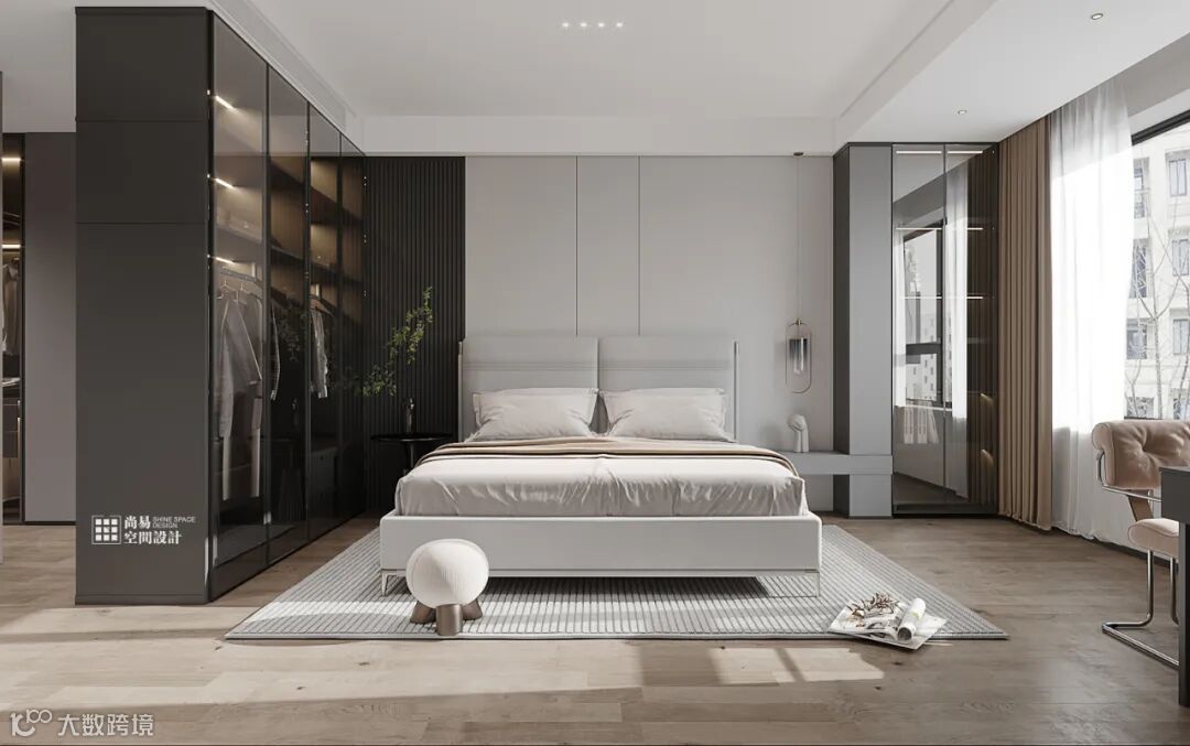 装饰上隐形灯带。Concise and unique with simple charm.靠墙位置的衣柜做开放式装饰柜,In a large flat space,