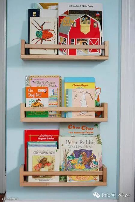 孩子们的书整齐地展示在门口的搁板上,漂亮的封面一览无余。在给宝宝讲睡前故事的时候,伸手就可以拿到想要的那一本。