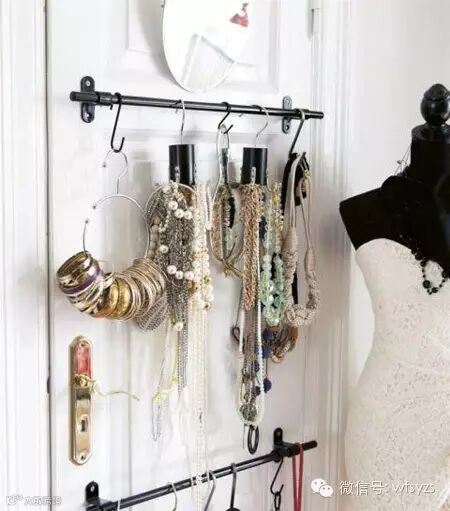 一串一串的首饰,放在盒子里很容易就缠绕在一起,而挂起来就不会出现这种情况。可以用毛巾架当挂杆,挂钩可以根据需要自行配备。