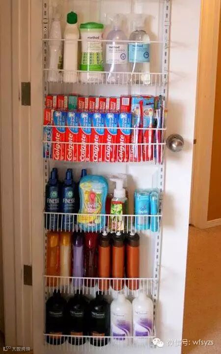 有的朋友喜欢一次性买很多洗漱用品,以备不时之需,小小的卫浴间未必塞得下这么多瓶瓶罐罐,这时浴室门上的收纳筐就派上了用场。
