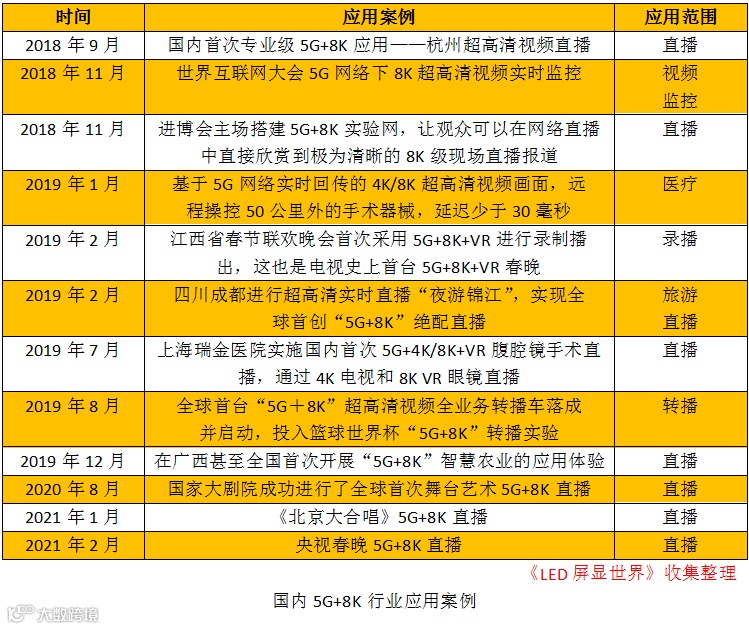 从表中可以看到,大型直播活动如展会、舞台、体育赛事等在国内已成为8K最先应用的场景。不仅国内,早在2015年,日本NHK就已经开始尝试使用8K技术对加拿大女足世界杯进行直播。虽然起步较晚,但我国在5G+8K方面的发展速度较快,短时间内就在各大活动中得以应用,其中LED显示应用企业功不可没。