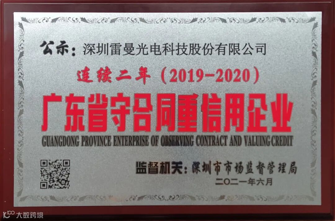 人无信不立,业无信不兴。诚信经营是企业持续发展的基石。近日,广东省市场监督管理局再次授予雷曼光电2020年度“广东省守合同重信用企业”荣誉称号,以表彰我司在守信经营方面的突出表现,这是雷曼光电坚持守法经营、深入推动诚信合作所取得的成果。
