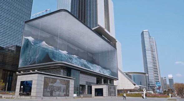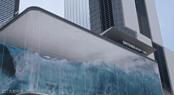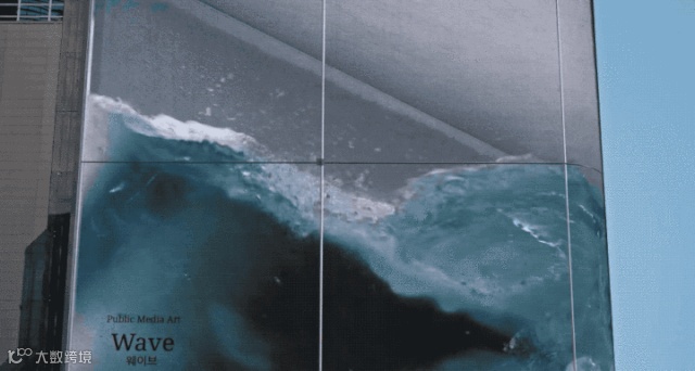 这座建筑的电子显示屏宽80米,高23米,巨大的屏幕包裹着整个建筑,正在播放着汹涌的韩国波浪画面,这些与韩国文化有关的内容自上世纪90年代以来在全球范围内受到欢迎。对于此屏幕,d’strict创建了第一个变形的幻觉投影,因此被命名为wave(波浪)。