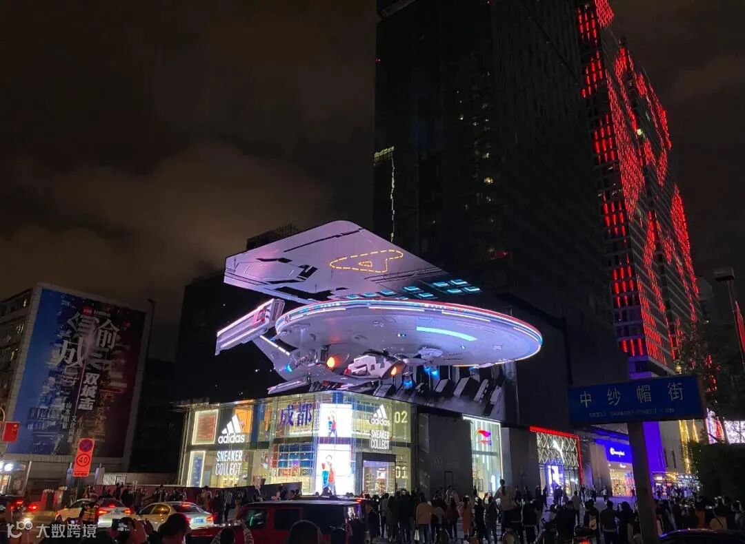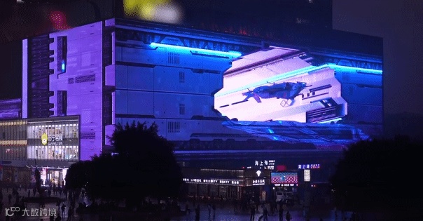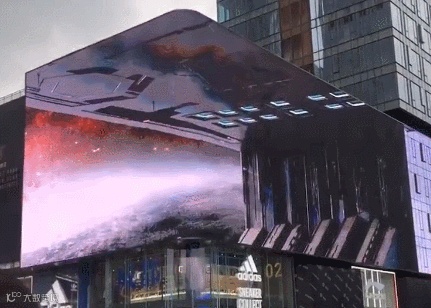 重庆观音桥商圈一栋大楼3788平方米的巨幕LED屏上,出现了一座未来城市,一辆小车飞驰而过,紧接着,一艘神秘的太空飞船从屏幕中缓缓驶出,并围绕大楼旋转飞行。市民在目睹全过程中,不需要任何设备,仅通过裸眼就能感受到逼真震撼的3D视觉效果。
