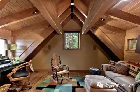 这个客厅阁楼装修没有改变阁楼的固有形态,里面的装修设计、家具布置也都是完全按照阁楼的走向来的。从阁楼客厅装修效果图来看,这个客厅装修风格时非常贴近大自然的时尚田园风,用料多为原木,为了达到放松的目的,沙发、摇椅都非常地贴合人体的设计,而颜色独特的地毯也与这些家具浑然一体。这个客厅阁楼装修最大的与众不同之处在于设计师充分利用了阁楼特有的私密性,在将它设计成客厅的时候还装修成了书房。而阁楼三面均有的大小不易的窗户保证了它的采光与通风。