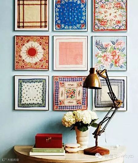 编辑点评:没功夫花那么多心思,好,找出一些好看的旧手帕,然后平稳放置在简单的相框里,以布料来做照片墙设置,精致的花纹、可触的手感都让这样的细节成为家里最精致的去处之一。