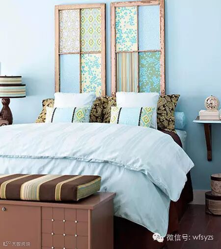 编辑点评:废弃的窗户框,里面衬上好看的布料,不同花色的布料看似随意拼接起来,但却又让人感受到精致不俗的视觉观感。蓝色墙面上的这一小细节设计,打造出了不一般的床头背景墙,布料的选择考虑到了墙面颜色的配合,虽然不同布料拼接,但整体融入度很高,不会觉得突兀。
