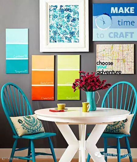 编辑点评:还是前面的招数,只不过更简便易行。简单的白布上染上不同的色块,简单干净的设置只要花了心思来配色跟摆放,一样可以打造出明艳好看的家居场景。