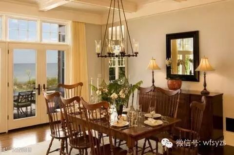 这间餐厅装修成了美式风格。异域情调明显的它在灯具的选择上很下功夫,比如它的吊灯以及旁边柜子上两盏台灯。无论是造型还是颜色都让人感受到美式独特的乡村风味。这是餐厅装修的第四个技巧:如果你的装修风格是异域风情,那么在灯具等细节上都要展现出它的特色,追求整体的一致性。