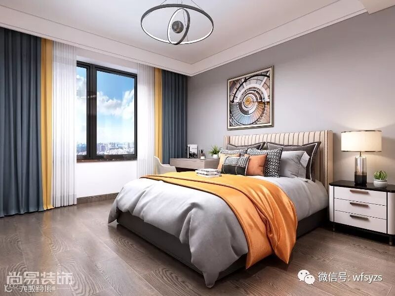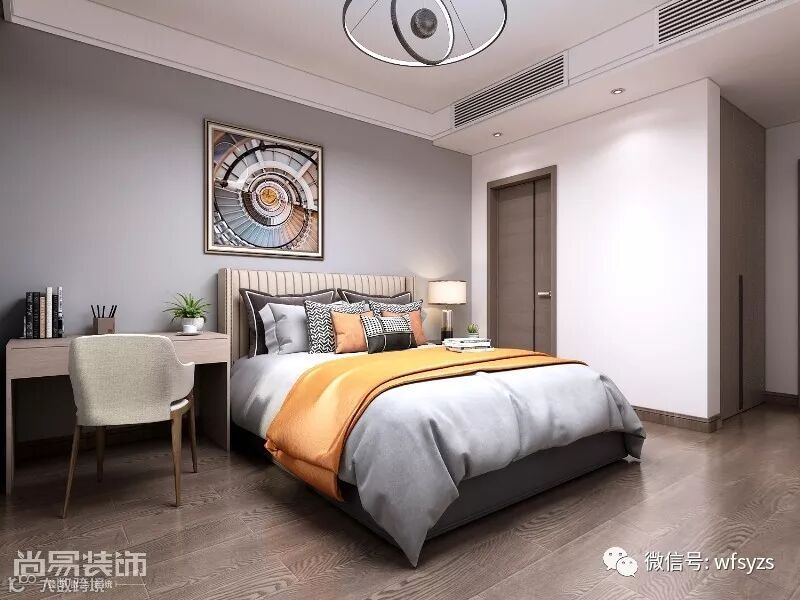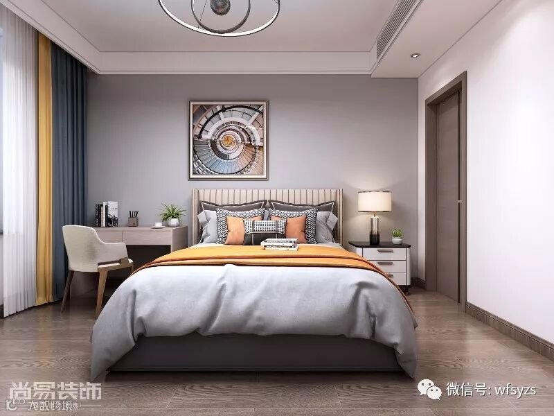▲主卧延续整体风格,浅灰色背景墙结合浅色家具和卧床,尽显清新淡雅,偏抽象的装饰画极具艺术性。