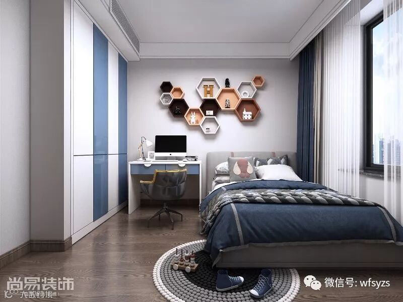 深蓝色的床头墙搭配几何图样满足男孩对未来的探险精神。