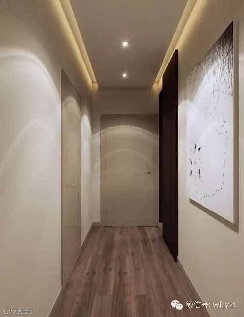 这是很多家里常见的过道样式,短促且偏窄。地板颜色跟墙壁色调搭配起来,真是绝配,白色大幅的装饰画,让墙壁呈现更多装饰元素。