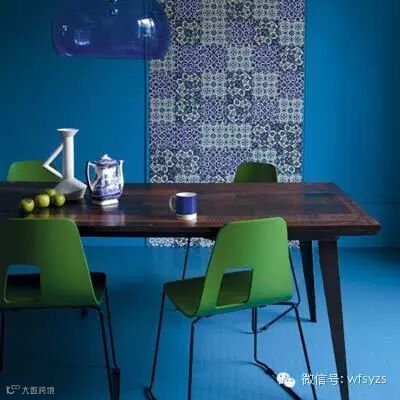 蓝色清新淡雅,与各种水果相配也很养眼,但不宜用在餐厅或是厨房,蓝色的餐桌或餐垫上的食物,总是不如暖色环境看着有食欲;同时不要在餐厅内装白炽灯或蓝色的情调灯,科学实验证明,蓝色灯光会让食物看起来不诱人。但作为卫浴间的装饰却能强化神秘感与隐私感。