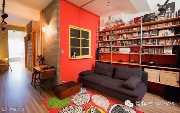 客厅在家庭装修中大都数以大气、简单为主,如果空间本身不够大的话,客厅空当当的显得有些浪费。考虑到这一点,这款书房就是嵌入在客厅里,沙发背后安置个小型的书房,整个一面墙嵌入书柜,再运用多种材质装扮客厅,如墙砖,红色涂料涂满整个墙面。再铺上自己喜爱的卡通色地毯,活泼氛围油然而生,即使少了太阳光照,好心情依旧在。平时在客厅休息时转身分分钟钟就能阅读自己喜爱的书籍,在这样的氛围下,不爱上阅读都难。