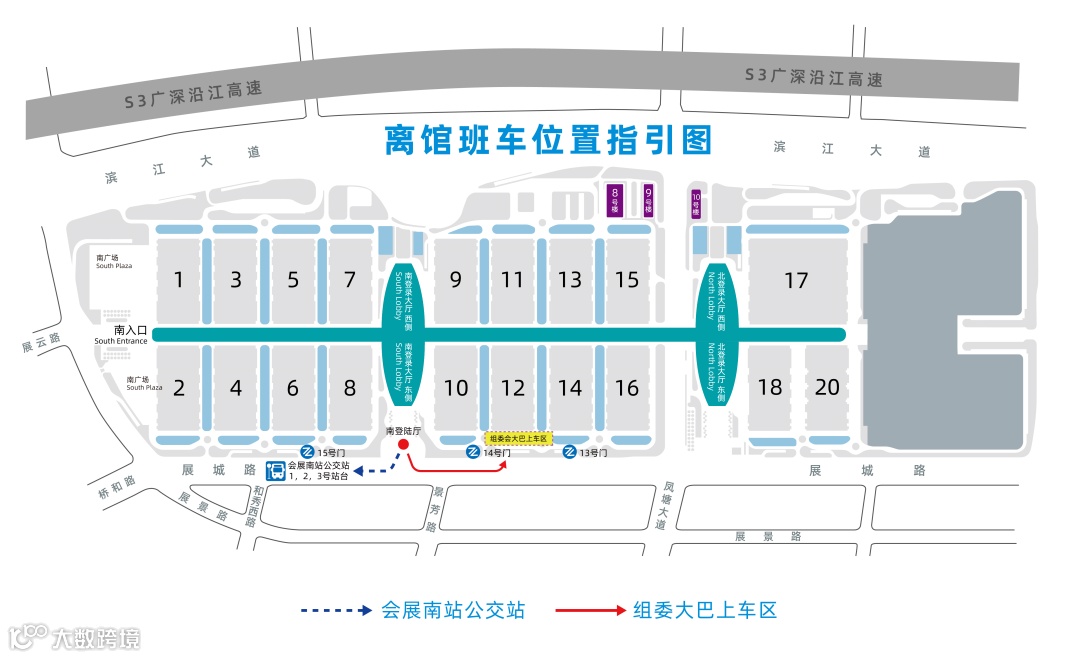 S3沿江高速 → 国际会展中心收费口 → 凤塘大道 → 展景路 → 滨江大道