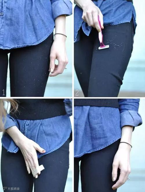 黑色打底裤沾毛?用剃毛器先把毛毛刮到一起,再用胶条粘几下就干净了。此法同样适用于羊毛大衣。