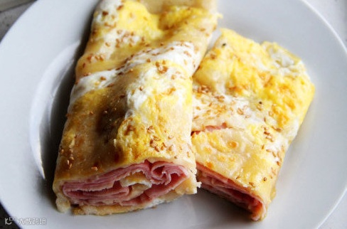 ▲面粉 50克、鸡蛋 1个、火腿 4片、水 125克、白芝麻 少许、食盐 1克、植物油 1汤匙