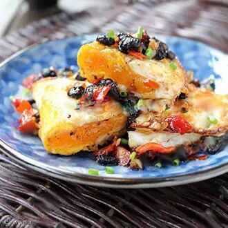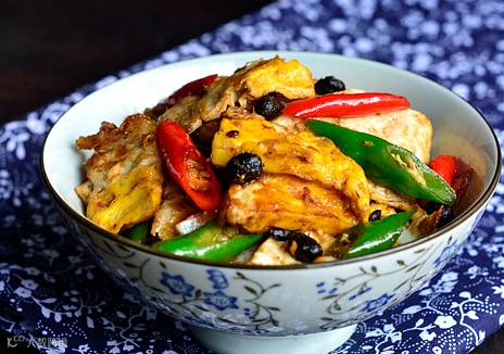 3、翻过来煎另一面,待两面煎至嫩黄色即可盛出;锅中留少许底油,下蒜末和豆豉