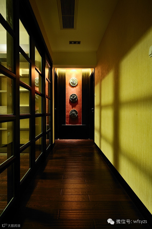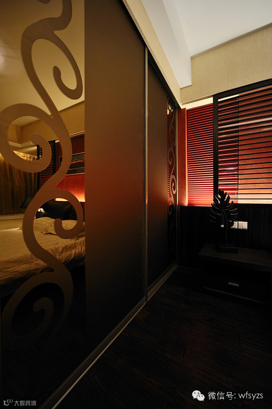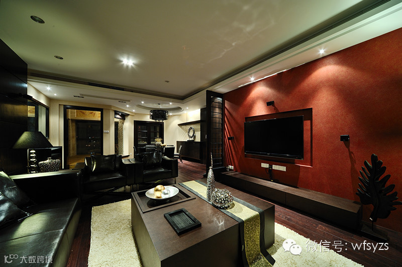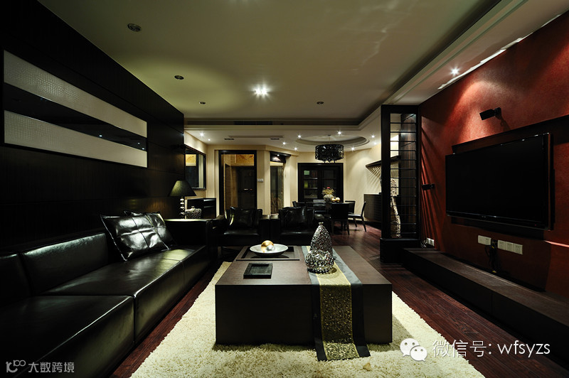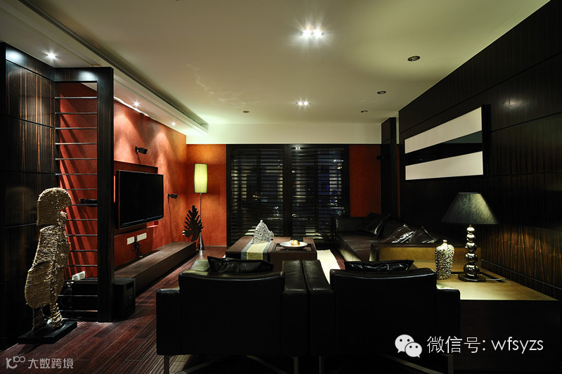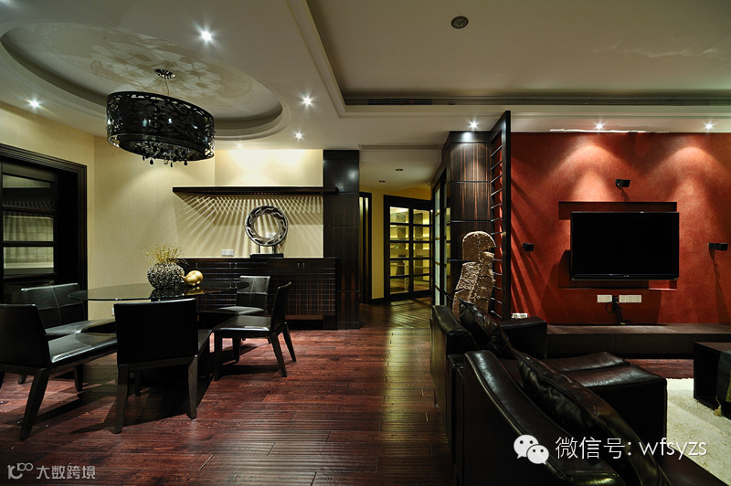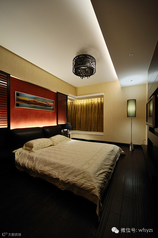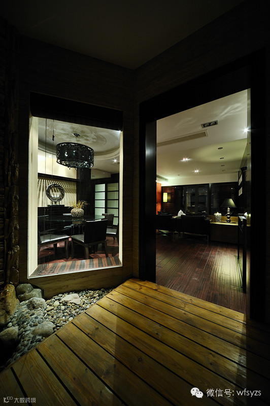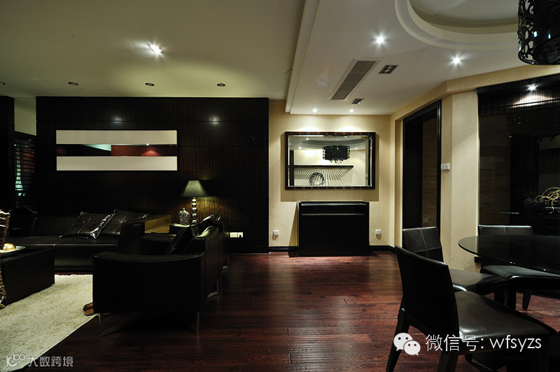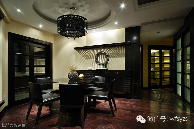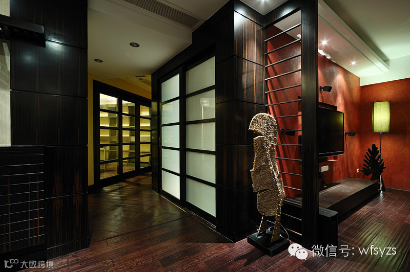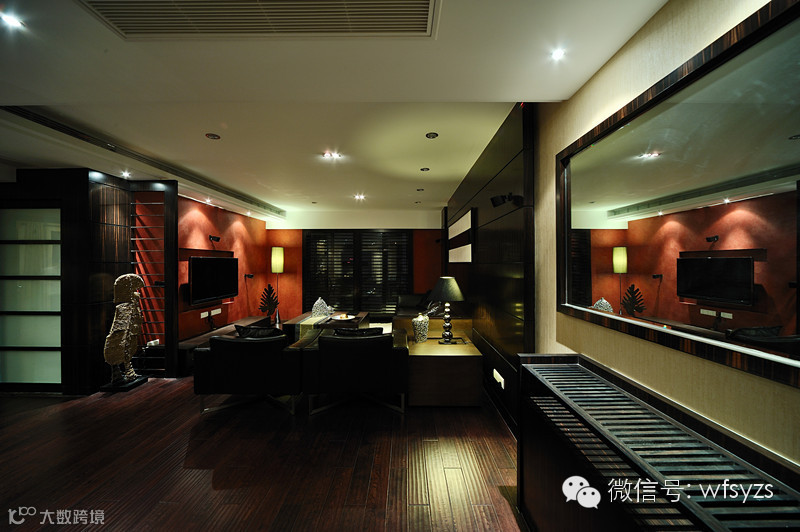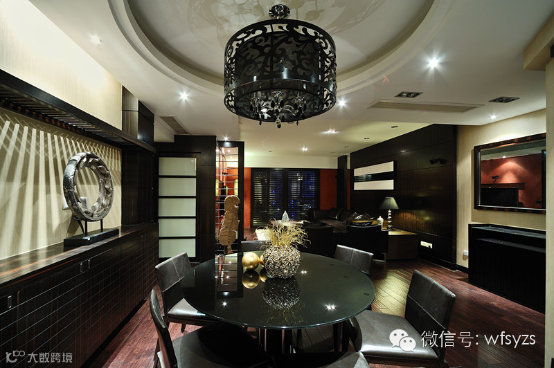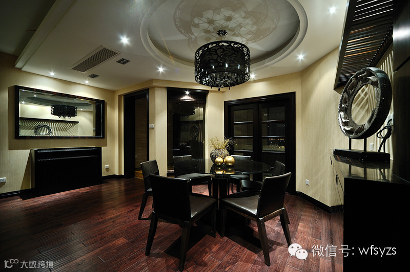 设计师从不同的角度对传统空间进行了新的诠释。天然黑檀木的材质,将整个居室的格调定位在一个较高的的水平。深色的渲染,使整个空家充满了沉稳,厚重的气氛。地面是暗红色的木地板,洁白的地毯如同一朵在水中绽放的睡莲,沉睡在这片圣洁的地域中。