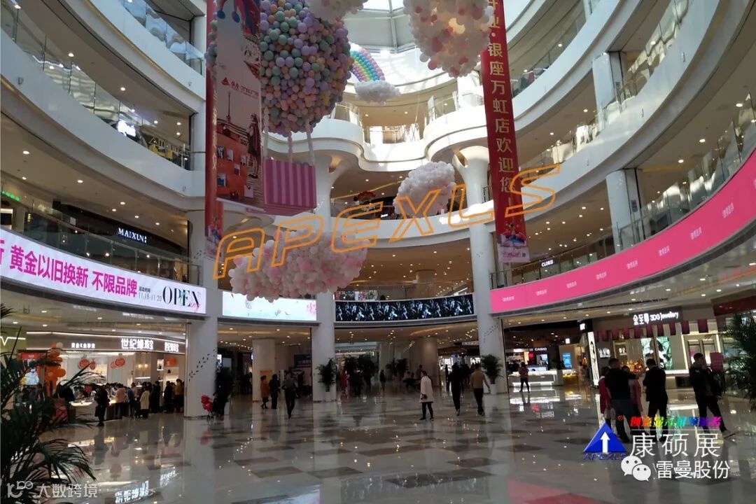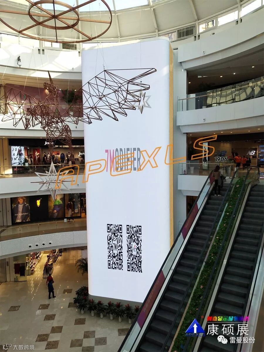 此两块LED创意显示屏均采用无缝拼接技术,画质细腻且流畅、色彩绚丽,也是整个商场的最佳广告位,屏体循环播放各类宣传视频或商家广告,在提升商场的品味的同时,也为商场带来巨大的广告收益。