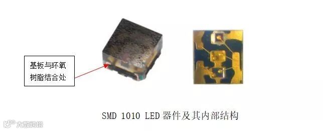 1010 LED器件的基板与外封胶环氧树脂的结合处,是高分子材料、金属等多种材料的结合部,由于多种材料的物理特性差异,导致这个结合处是密封性最差的薄弱环节,所以液体、湿气等很容易从这个最薄弱的环节进入LED器件内部,84消毒液也很容易进入LED器件内部。LED器件内部包含的LED芯片,通过金属线键合与金属基板相连,金属基板有铜、银或者金等金属材料,84消毒液腐蚀铜等金属基板后,会造成金属线断线进而造成LED灯珠死灯。