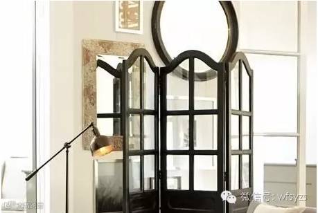 黑色的门型屏风与后场圆形的黑框镜子