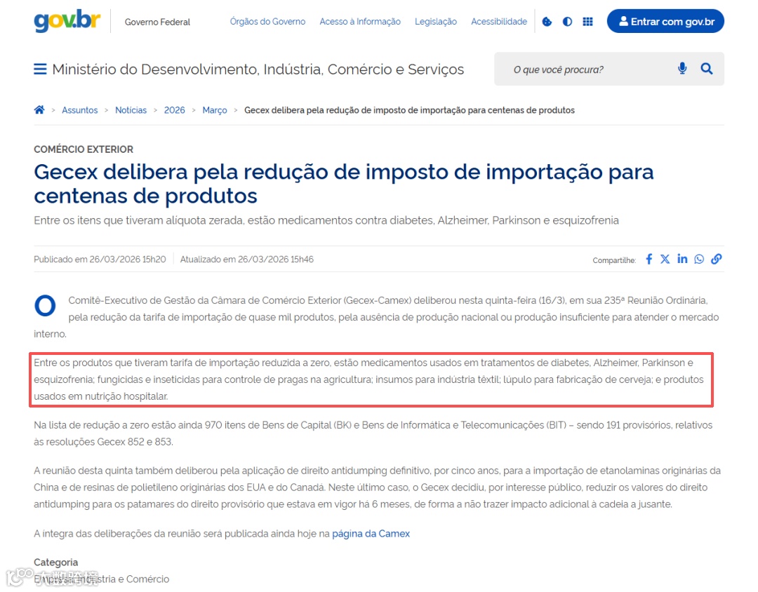 巴西发展、工业、贸易和服务部宣布对970种产品实施进口零关税。外贸委员会执行管理委员会作出该决定,原因是这些产品在国内生产不足或无产能满足市场需求。其中779种为延续此前关税优惠,191种为新增临时调整,为期4个月,是对今年2月电子产品加征关税政策的补充调整。