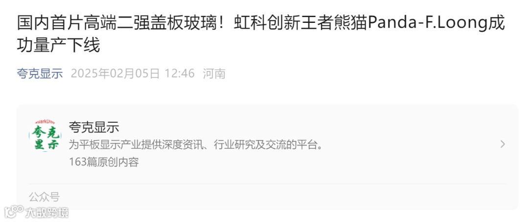 国内首片高端二强盖板玻璃!虹科创新王者熊猫Panda-F.Loong成功量产下线 https://mp.weixin.qq.com/s/1EBvU93ppKtRjj37_rEJxw