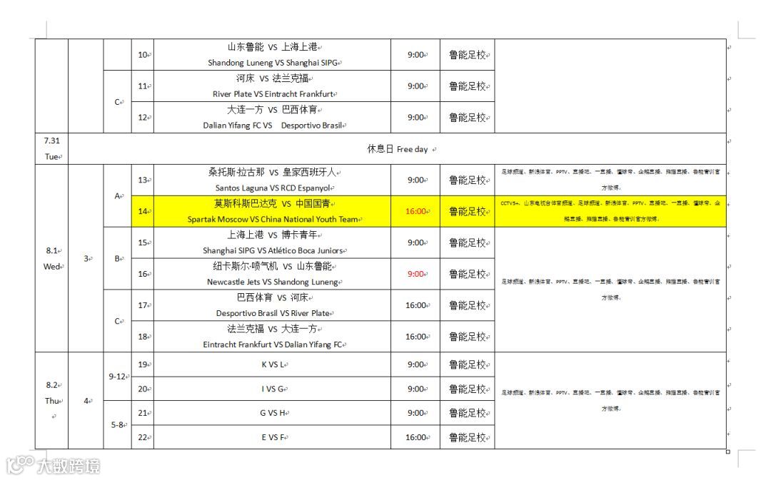 A组: 中国国青、皇家西班牙人、桑托斯拉古那、莫斯科斯巴达克