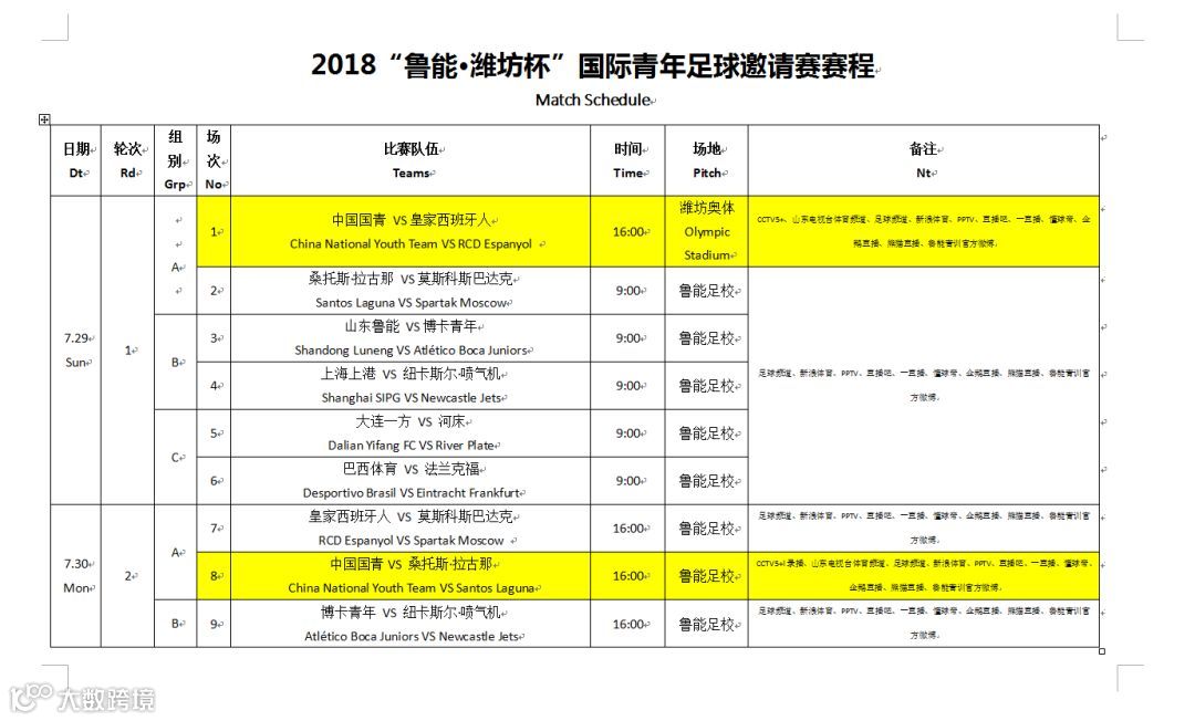 7月17日,中国足协在官方网站公布了2018年“鲁能·潍坊杯”国际青年足球邀请赛的完整赛程,本届杯赛将于7月29日-8月4日在山东潍坊奥体公园体育场、山东鲁能泰山足球学校进行。