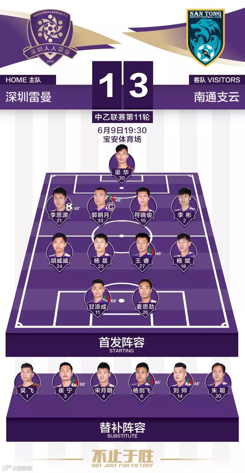 比赛第40分钟,南通支云后场长传策动进攻,锋线队员反越位成功后形成单刀球破门得分,南通支云队一球领先上半场。下半场第48分钟,深圳雷曼队扳平比分,李思源禁区前沿30米处迎球劲射破门。第49分钟,南通支云队边路传中头球进球,再次取得领先。下半场补时阶段,南通支云队反击中扩大比分。