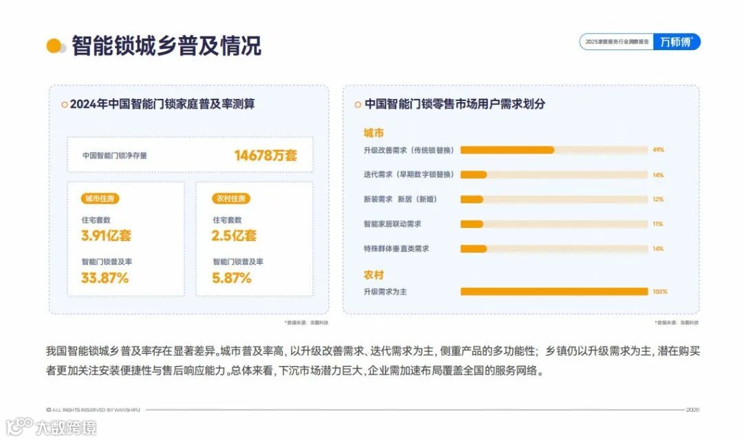 智能晾衣架行业呈现结构性增长,中端产品占63%市场份额。智能锁市场增速趋缓,首批用户进入5-7年换新周期,城乡渗透率差异显著(城市33.87%,县域5.87%)。