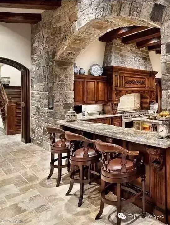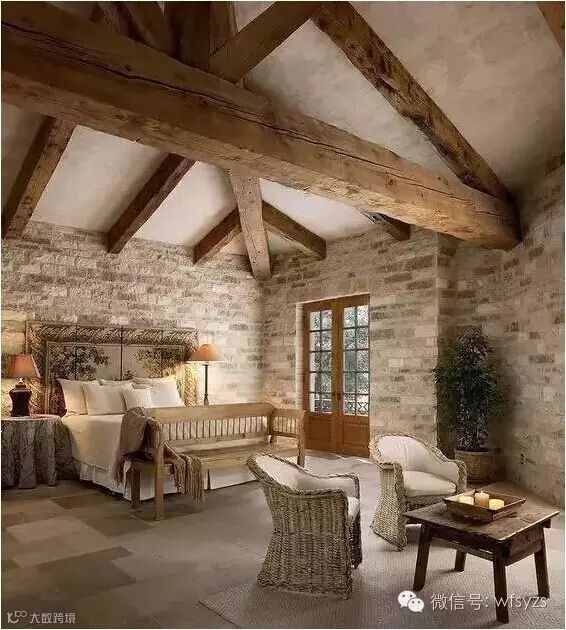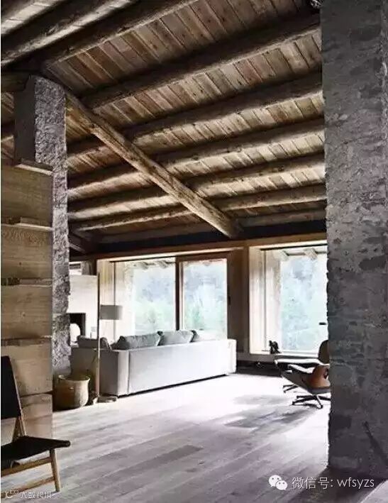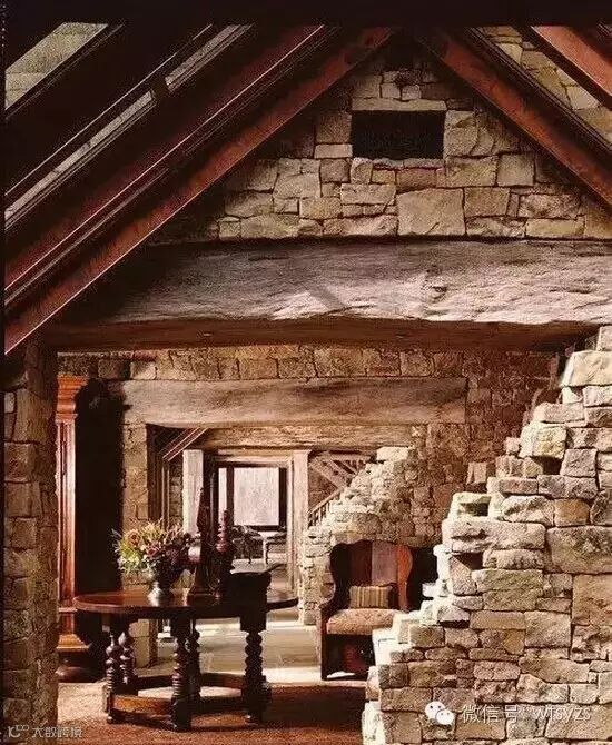 毛石一般裸露在外墙,尤其以美式乡村风格为主。将毛石的粗糙质感与质朴温和的原木加以搭配,能达到一种和谐自然的建筑效果。在设计师的手中,他们总能对两者加以精确地把握,从而营造出一种自然放松的氛围。