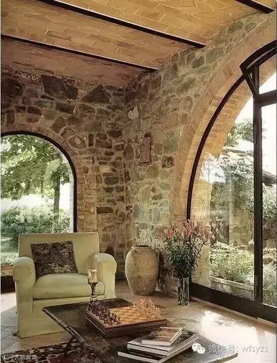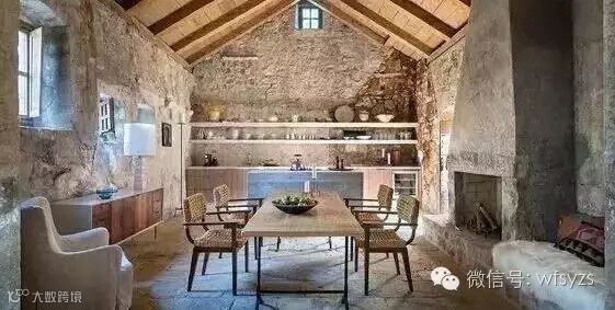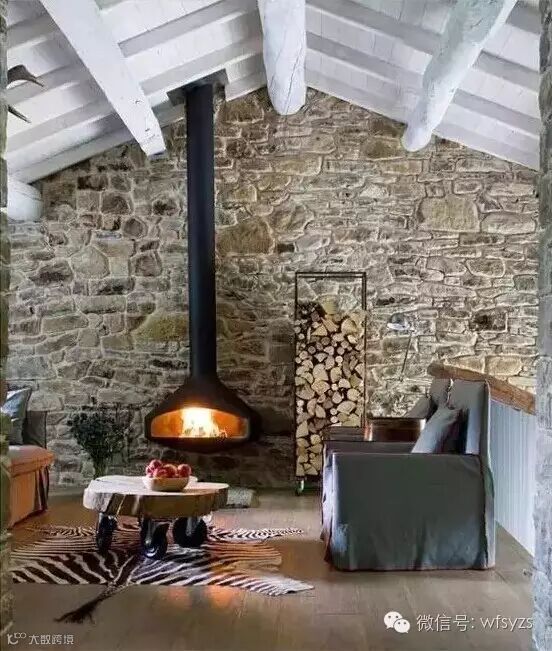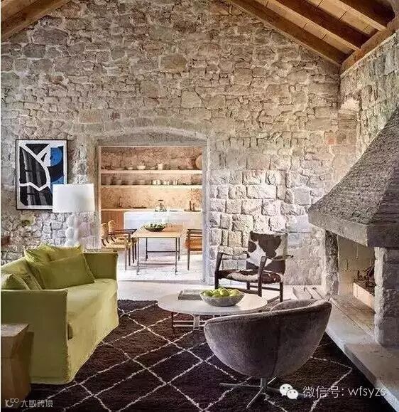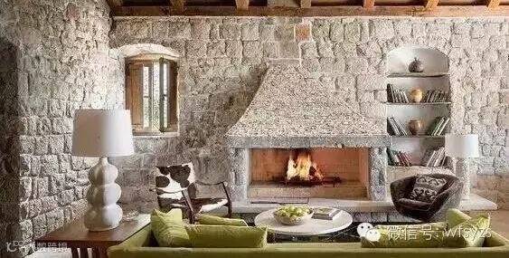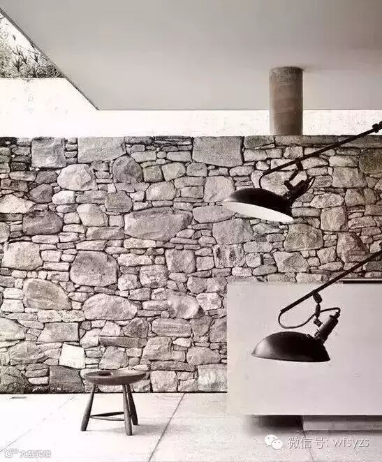 由于毛石是岩石经爆破后所得的形状不规则的石块,因此对毛石的选择也要有一定的讲究。用作墙体的毛石要讲究一定的平整度。这样的毛石墙体与精致的家具相比,虽然有一定的视觉冲击,但又不会失衡,给人带来新奇的效果。