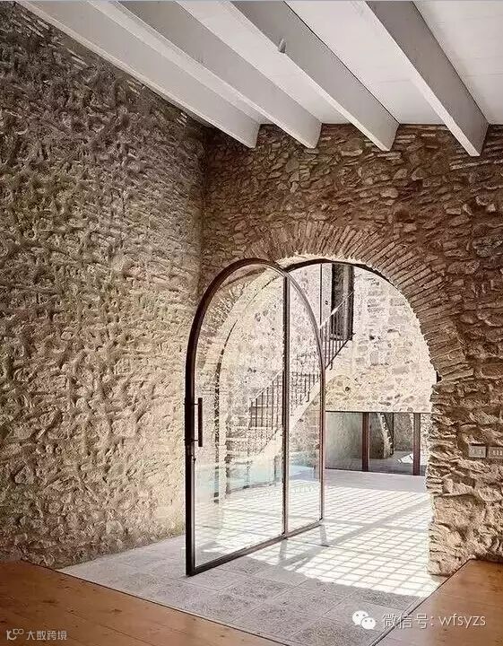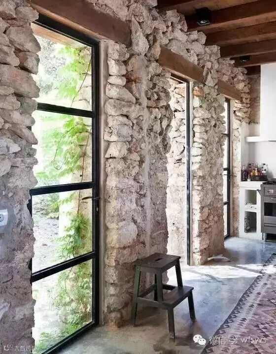 毛石是天然或从石矿里刚开采出来未经加工的,也称“乱石”。它的用途很多,砌筑基础、勒脚、墙身、堤坝等,在室外墙体中随处可见。但当它被混凝土包裹之后,我们确实很难见到它的真身。而现在,毛石这种特殊的建筑材料又卷土重来啦!今天我们要分享的是一组室内的毛石墙体,看看它会给我们带来什么样的视觉观感呢?