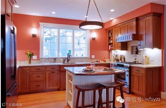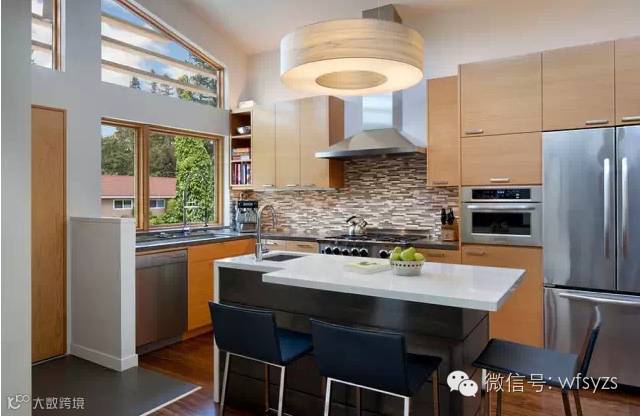 独立岛台厨房设计要求空间相对较大,要容纳下岛台还能有足够操作的空间,岛台是厨房的焦点,一切功用围绕它来展开,构成合理的三角动线。