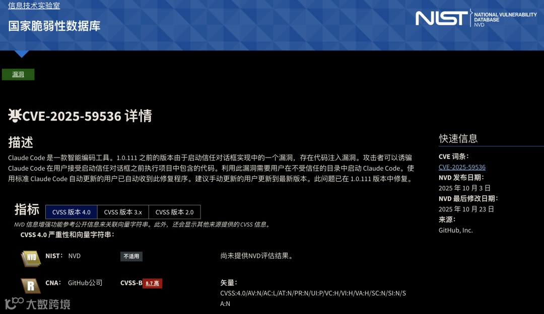 安全研究机构通过源代码审计发现严重隐患:Claude Code默认收集用户ID、邮箱、终端数据等敏感信息,本地存储采用明文JSONL格式。更严重的是,高危漏洞CVE-2025-59536允许攻击者通过简单指令控制用户设备——仅需在污染目录执行"claude"命令,即可悄无声开启摄像头并窃取密钥文件。